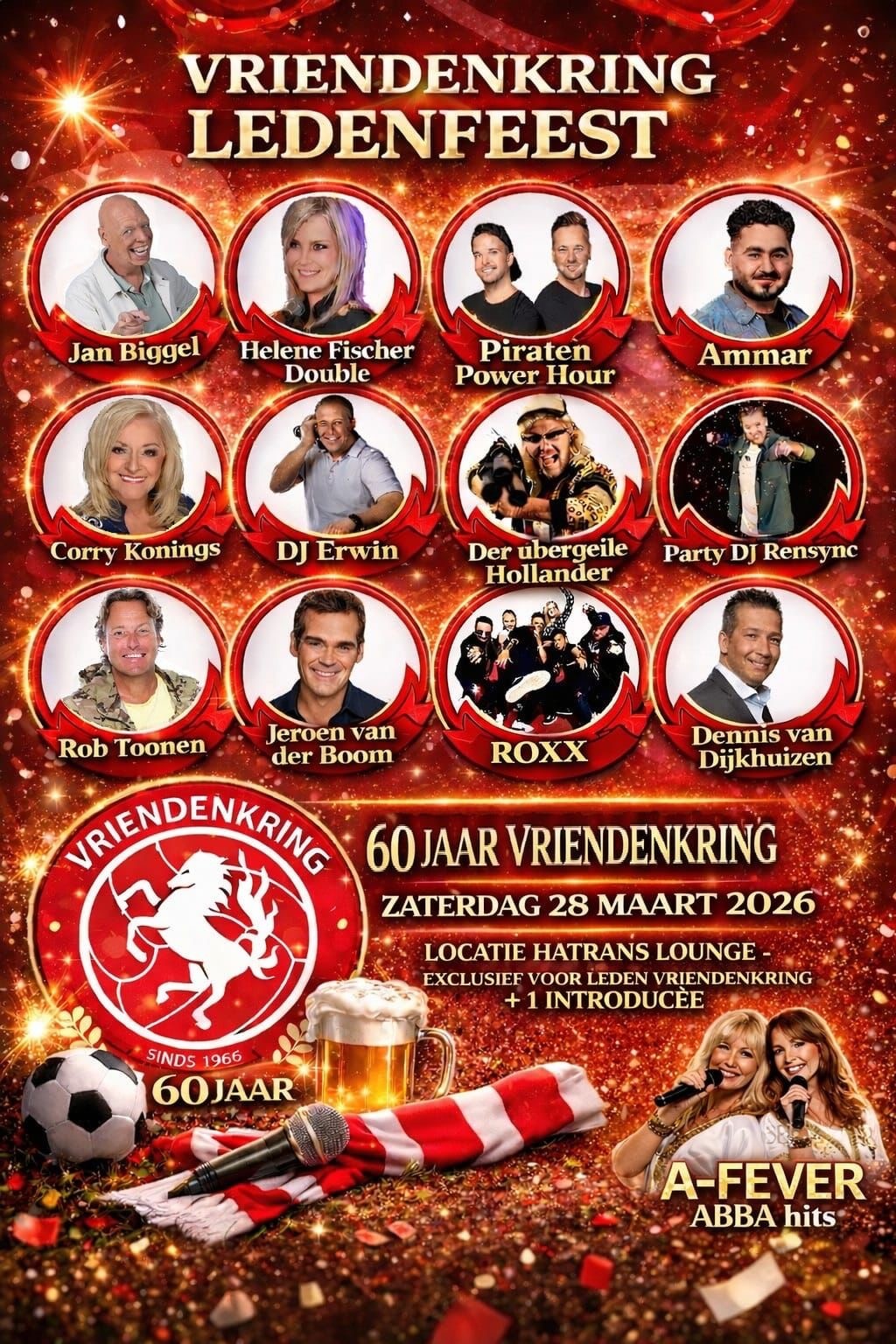 In 2026 is het 60 jaar geleden dat de Vriendenkring is opgericht. Vanzelfsprekend willen wij dit jubileum niet ongemerkt voorbij laten gaan. Op zaterdag 28 maart 2026 organiseren wij een groots en gezellig jubileumfeest in de Grolsch Veste, exclusief voor leden van de Vriendenkring.